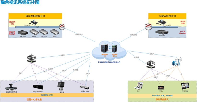 基于安徽農(nóng)擔(dān)公司現(xiàn)有的星形扁平化組網(wǎng)結(jié)構(gòu)。本次系統(tǒng)規(guī)劃以省公司融合視訊平臺(tái)服務(wù)器為統(tǒng)一通訊系統(tǒng),連接省、各地市、各區(qū)縣的硬件和軟件會(huì)議終端,實(shí)現(xiàn)全省視頻會(huì)議的組網(wǎng)和通信,分支機(jī)構(gòu)接入網(wǎng)絡(luò)支持WiFi互聯(lián)網(wǎng)和4G等接入方式。