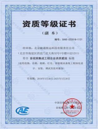 2018年5月20日,公司獲得了音視頻集成工程企業(yè)二級(jí)資質(zhì)的榮譽(yù);