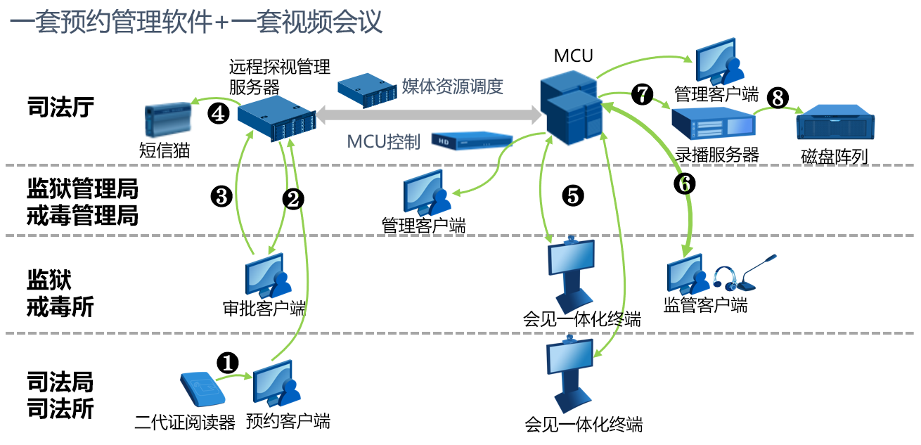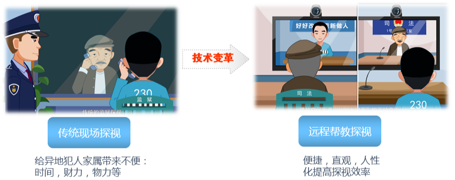 遠程探視系統(tǒng)以視頻會議聯(lián)網(wǎng)為基礎,圍繞服刑人員和家屬間便捷會面的新型探視管理手段。傳統(tǒng)遠程探視給異地犯人家屬帶來諸多不便,同時耗費大量的人力、物力、財力、時間等。新型遠程幫教探視系統(tǒng)更便捷、直觀,不僅能提高探視效率,同時兼顧人性化和高品質(zhì)。